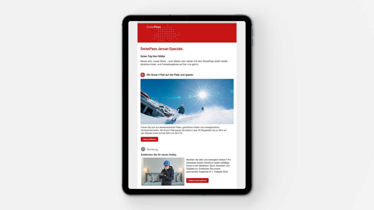 Special offers, competitions and ideas for trips related to the topics of ‘mobility’ and ‘leisure’: This is the SwissPass Newsletter, which appears in the inboxes of travellers and public transport enthusiasts in four languages every month.