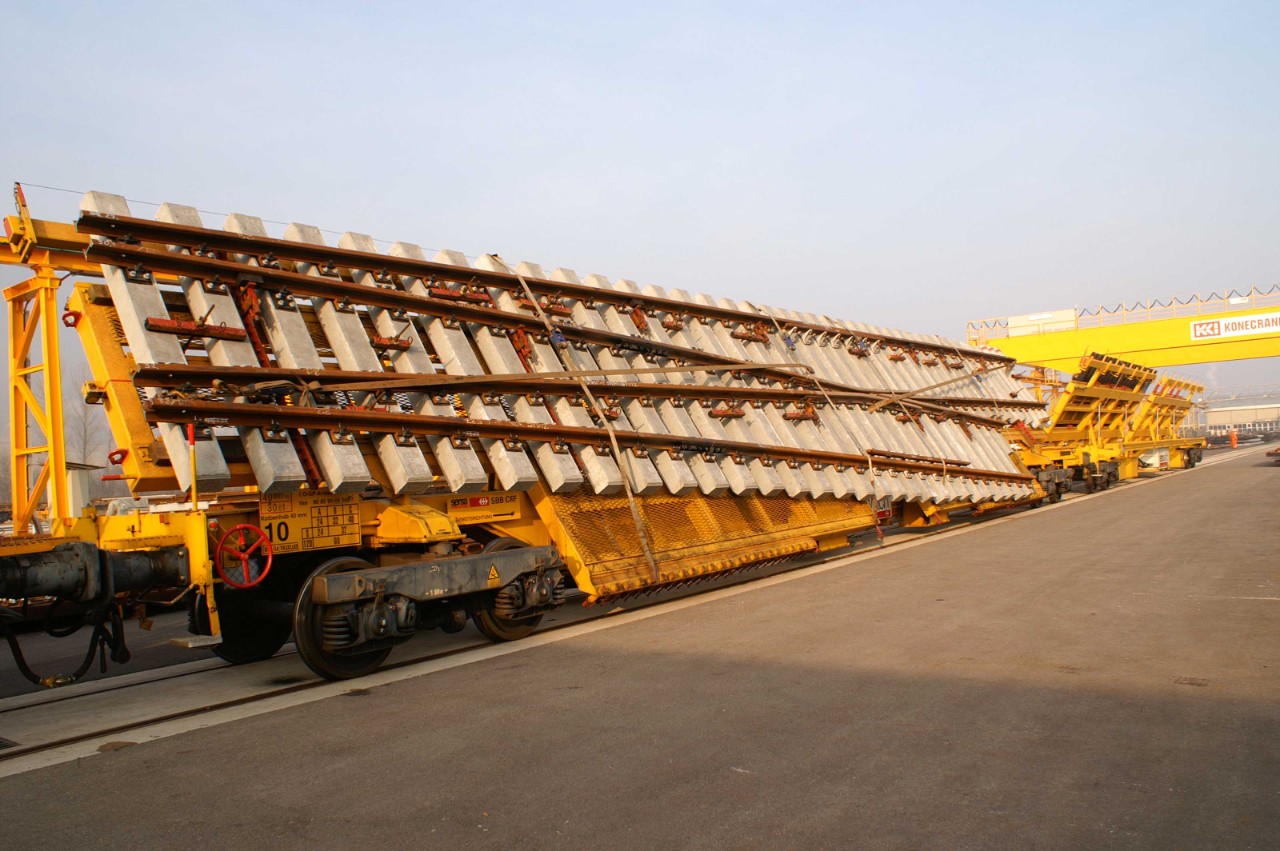 Depuis 1999, nous mettons en œuvre avec succès cette procédure qui constitue un gain de temps, de place et d’argent. Elle augmente sensiblement la qualité de fabrication et la précision des systèmes d’aiguilles fabriqués sur mesure. Forts d’une flotte de 32 wagons de transport pour appareils de voie, nous disposons des capacités requises pour garantir une logistique juste-à-temps. Tous les wagons sont équipés d’un dispositif de déplacement latéral pour un déchargement hors profil d’espace libre. Tous les transports sont planifiés par une équipe professionnelle, y compris la visite du chantier et la concertation avec le chef de projet compétent.